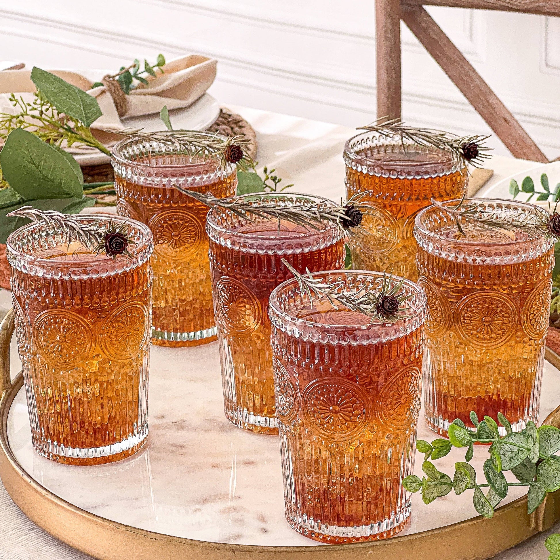 Our 13 oz. Vintage Textured Clear Drinking Glass is a clear cocktail glass that are embossed with vertical ribbed lines around the base and intricate circular patterns giving each glass not only the look of vintage glass, but the feel of it too! Just holding these glasses transports you to a simpler time when people played croquet in the front yard wearing white and people drank iced tea with a mint sprig and lemon wedge. Can you just imagine what that will do for your next backyard bar-b-que? All the sudden you are transported to a garden party in the south. You serve ice tea at your baby shower and all the sudden everyone starts speaking with southern accents. Embossed with vertical ribbed lines around the base and intricate circular patterns. Each glass is safely bubble wrapped and shipped in a brown box. Lead free. 13 ounce capacity. Hand Wash and Cold drinks only. Product measures 3.1" w x 4.8" h x 3.1" d