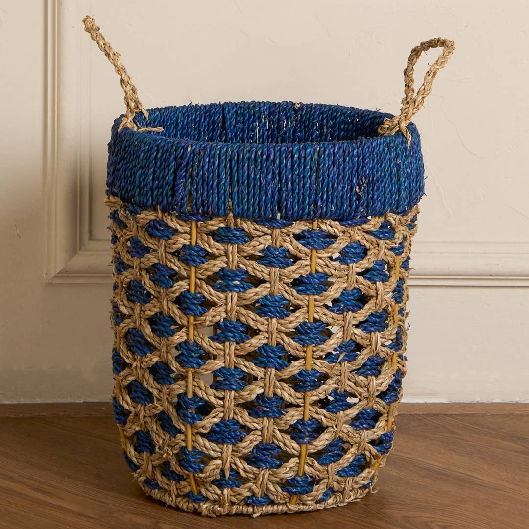 This Colorful Basket Set combines the beauty of colored seagrass with the strength of a metal frame, creating a unique and eye-catching addition to your home. Handcrafted with care, this tall woven basket features a distinctive diamond-shaped weave that adds a touch of elegance to any room.