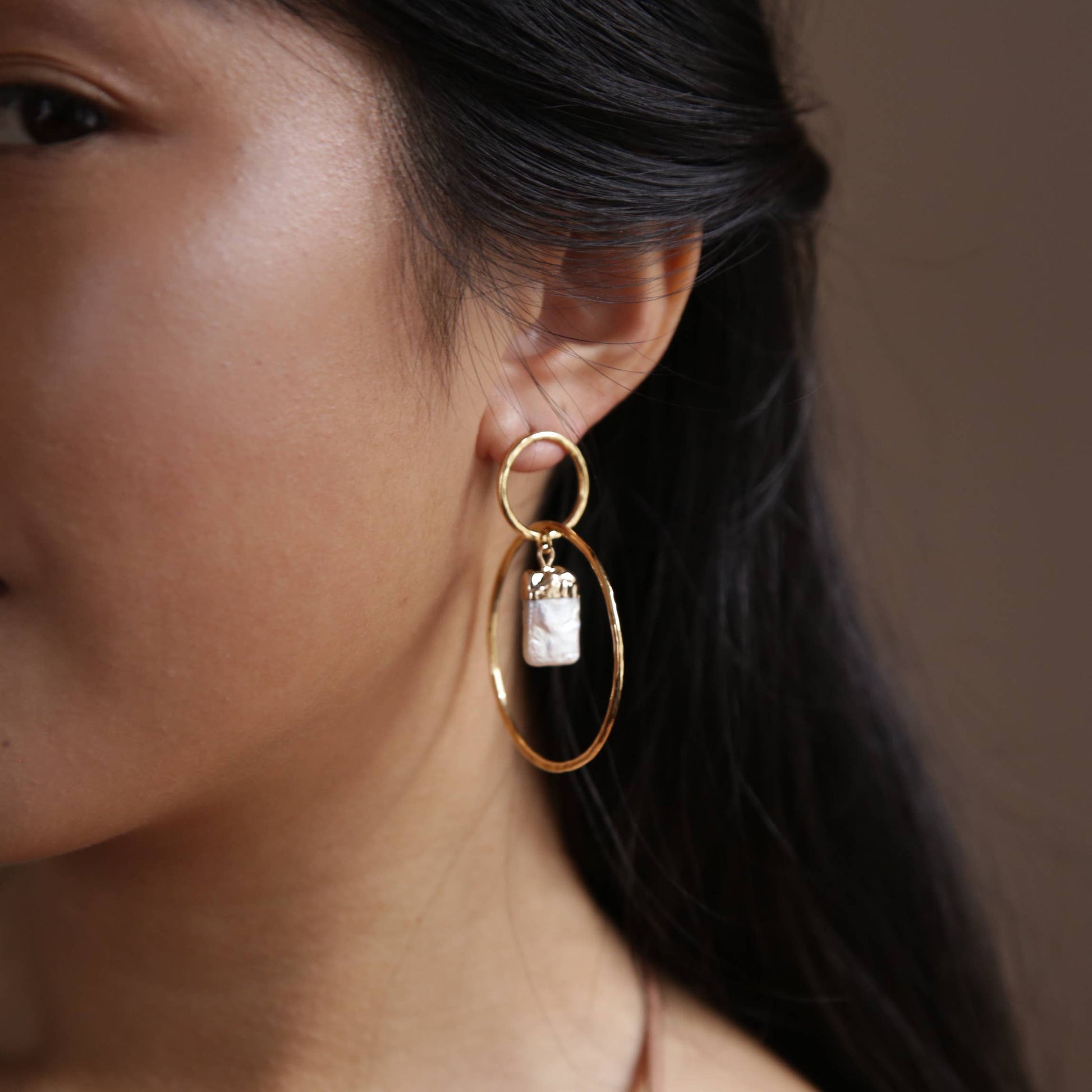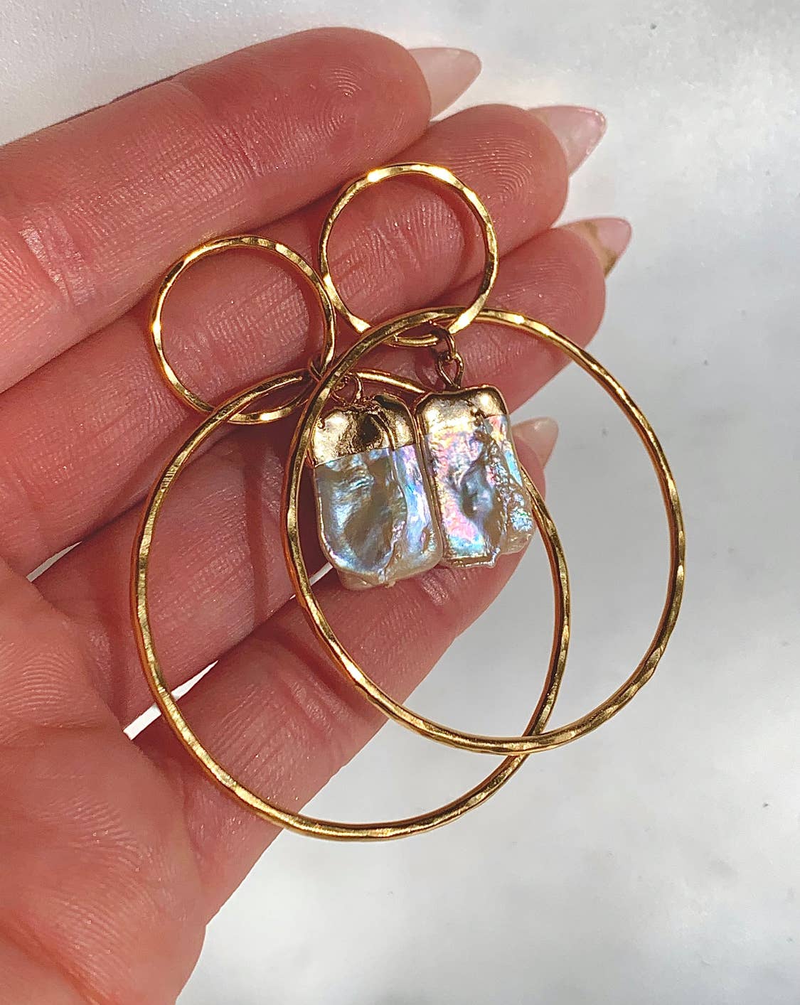 Beautiful glittering hammered hoops with free form Baroque pearls. Sterling silver ear posts suitable for sensitive ears, so lightweight and comfortable.