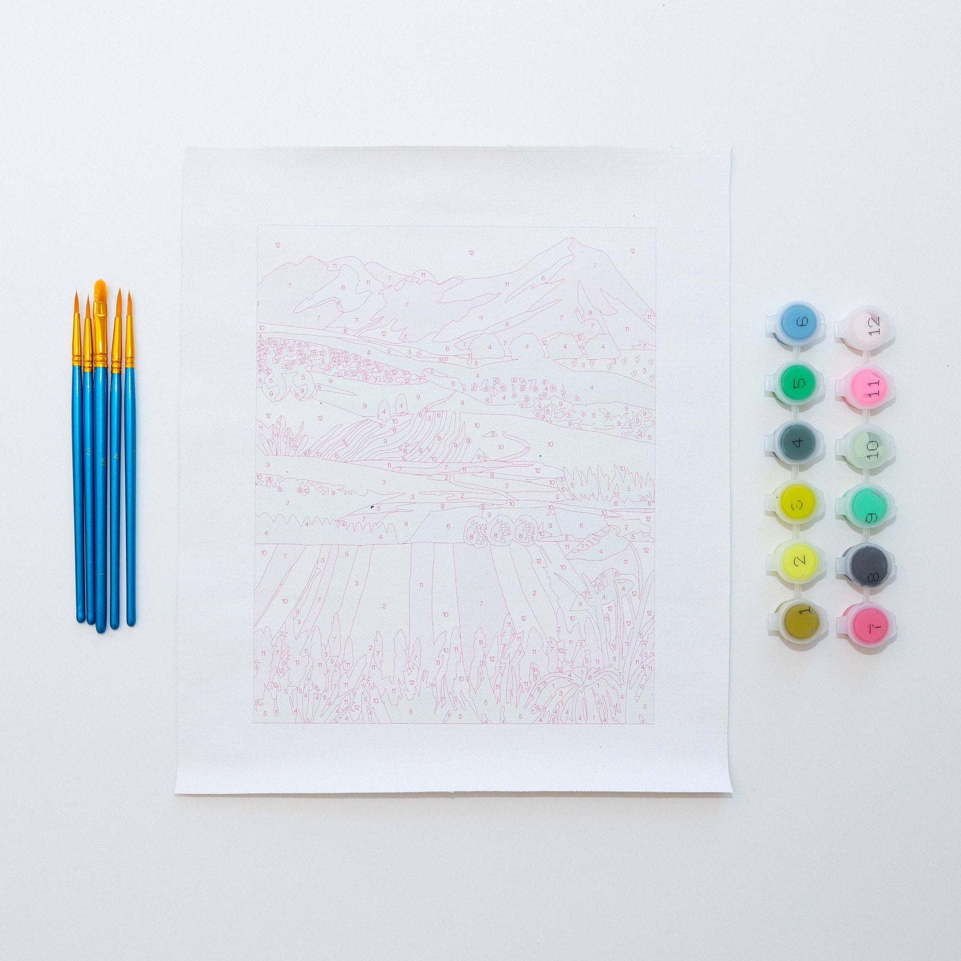 Each kit includes a a 8x10 inch printed canvas, a set of 5 premium brushes, and 12 pots of acrylic paint with the appropriate colors with corresponding numbers. Also to make your craft easy and more joyful we have added a small printed finished picture to guide and inspire your painting. Even if you are new to this whole experience still it will be worth every hour spent.