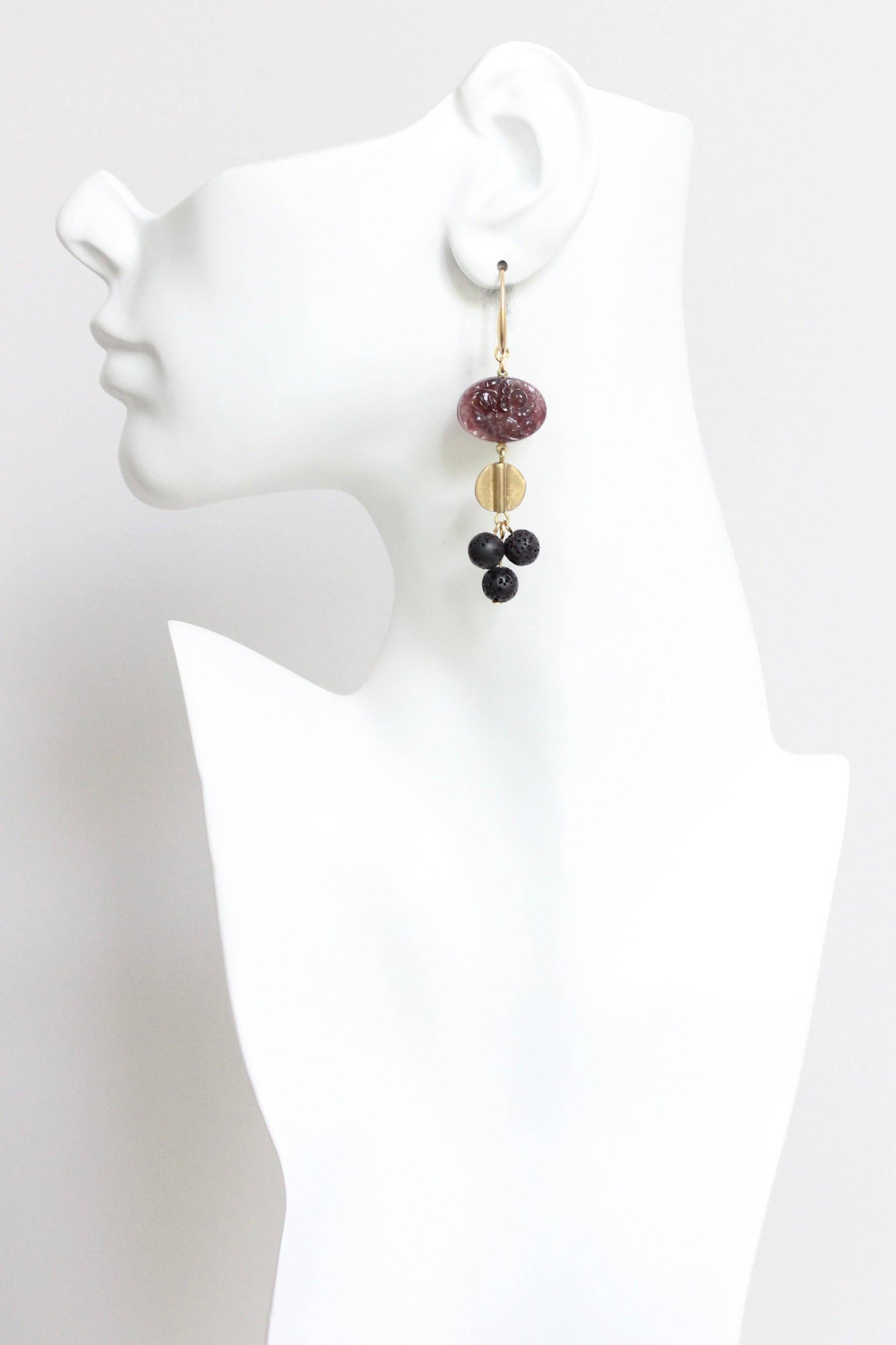Gold plated brass hook earrings with black lava beads and vintage purple pressed Japanese glass. Each earring measures inches and weighs ounces.
