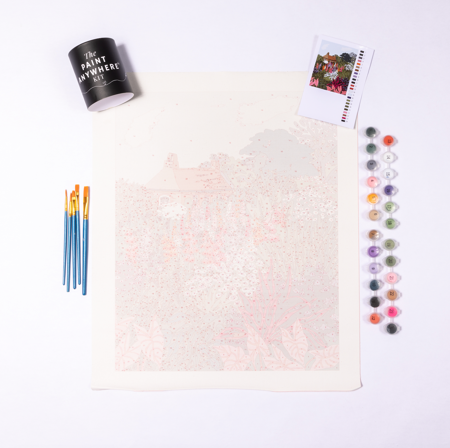 Each kit includes a a 16x20 inch printed canvas, a set of 5 premium brushes, and pots of acrylic paint with the appropriate colors with corresponding numbers. Also to make your craft easy and more joyful we have added a small printed finished picture to guide and inspire your painting. Even if you are new to this whole experience still it will be worth every hour spent.