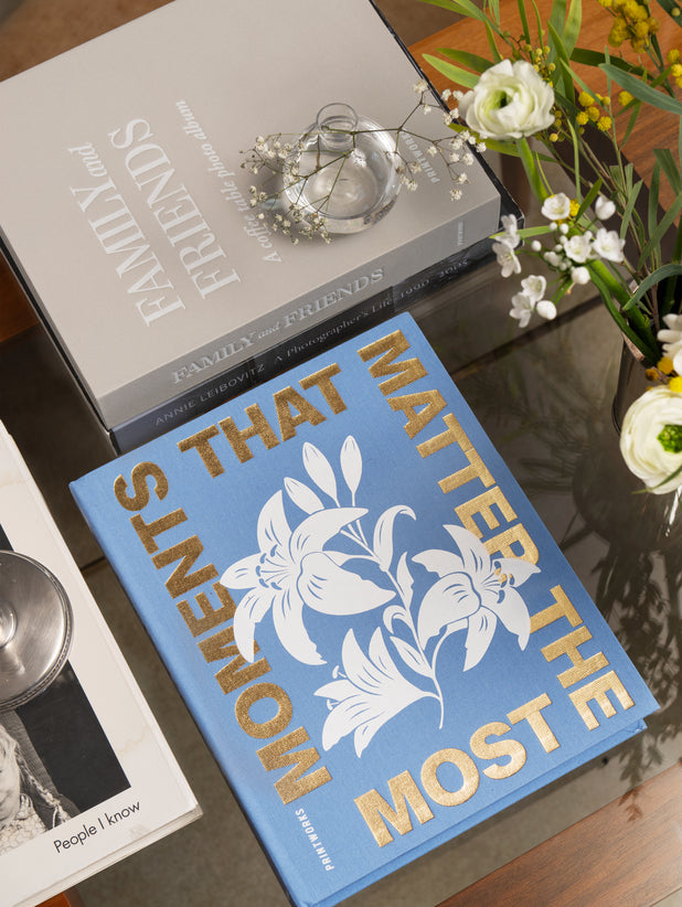 Moments that Matter the Most Coffee Table Photo Album featuring an elegant blue cloth cover with gold foiled text. Featuring a soft cloth cover, this album includes 30 pages of high-quality white photo paper, allowing you to attach your photos easily using our stickers or photo corners, which are bought separately.