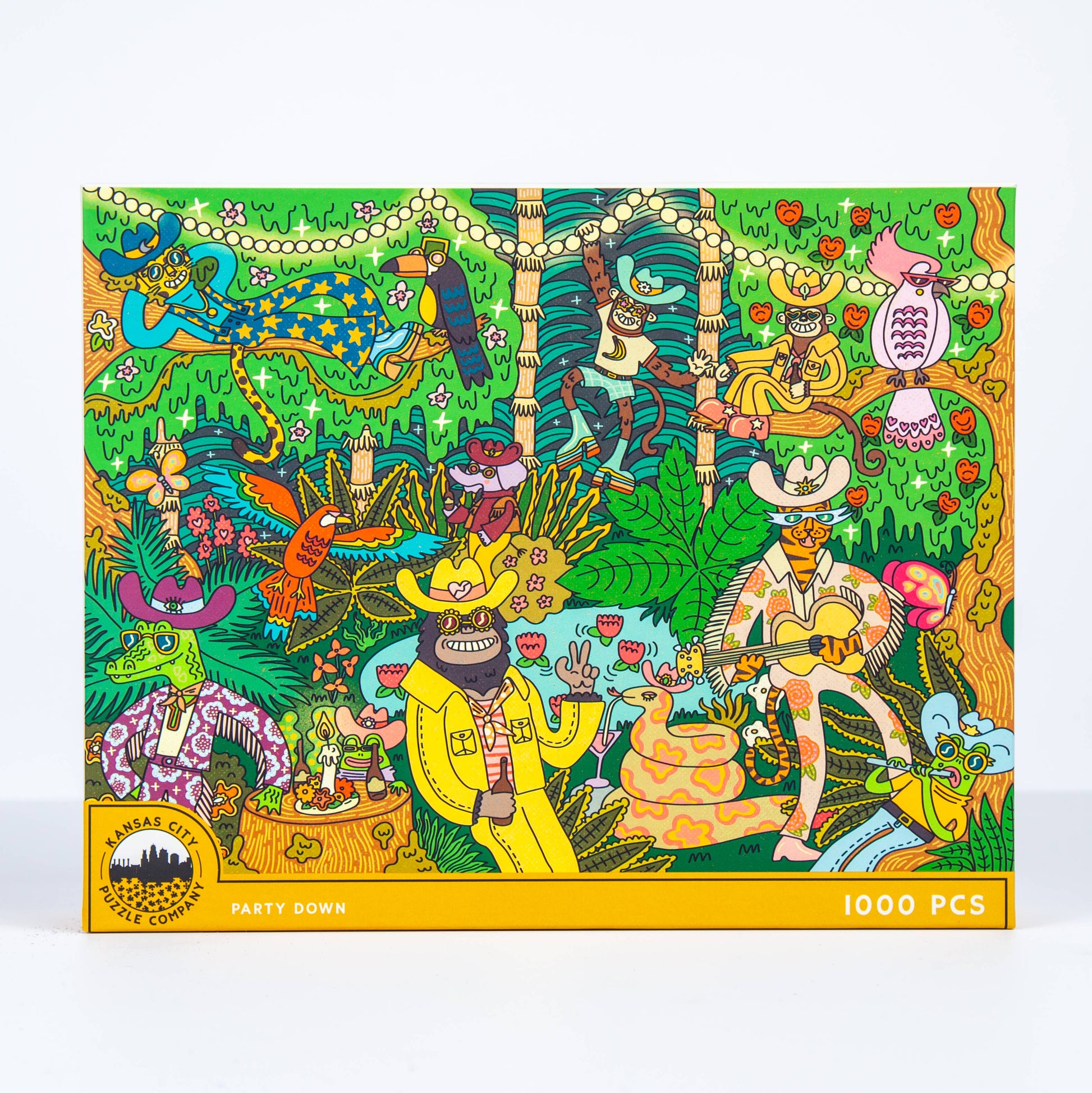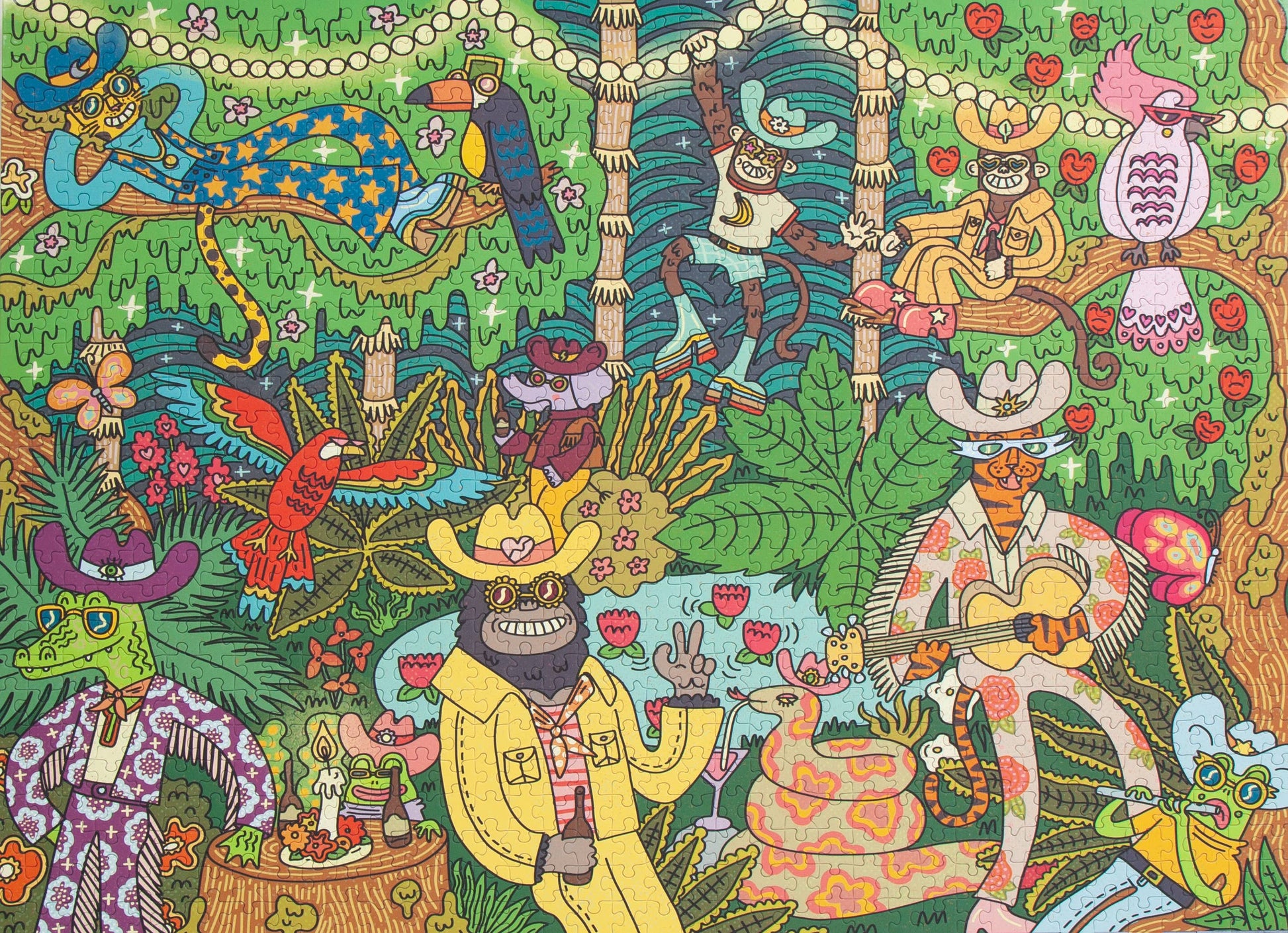 Details and vibrant illustration flood this humorous and quirky puzzle. Artist Emily M. Reay's unique take on a shit-kicking honky tonk party; filled with Nudie Suits and tuned to Charlie Rich. Absolutely cool. If the country reference isn't for you, don't worry; this puzzle is incredibly fun, totally weird and will quickly be one of your favorites.