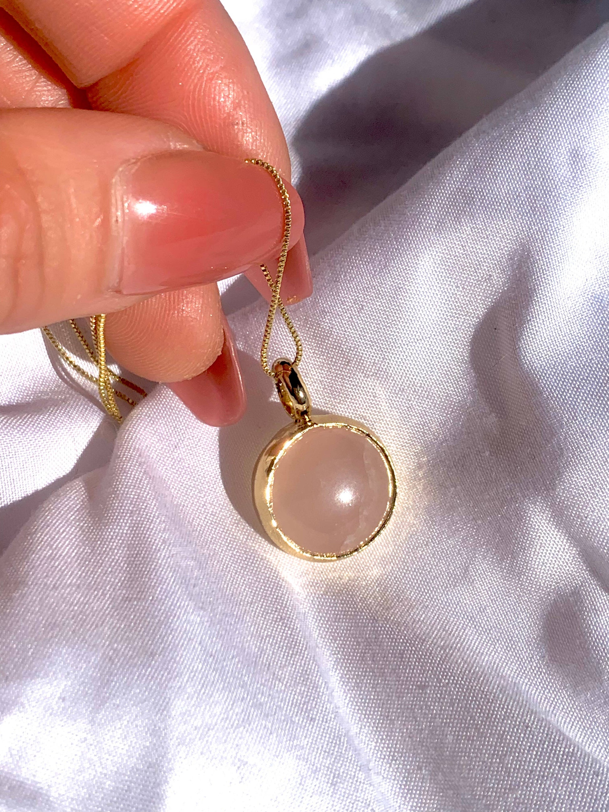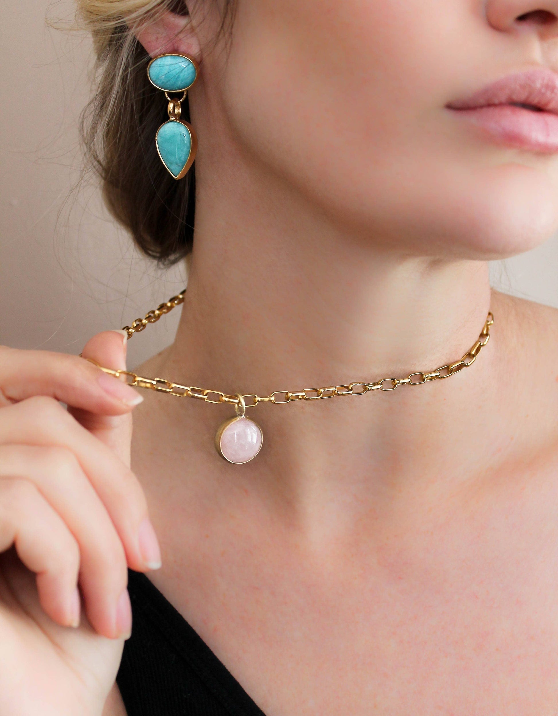 Beautiful rose quartz necklace, hand forged and set with the backplate sawed out so light can shine through it. Gold fill paper clip 20” chain or gold fill box chain 18”.