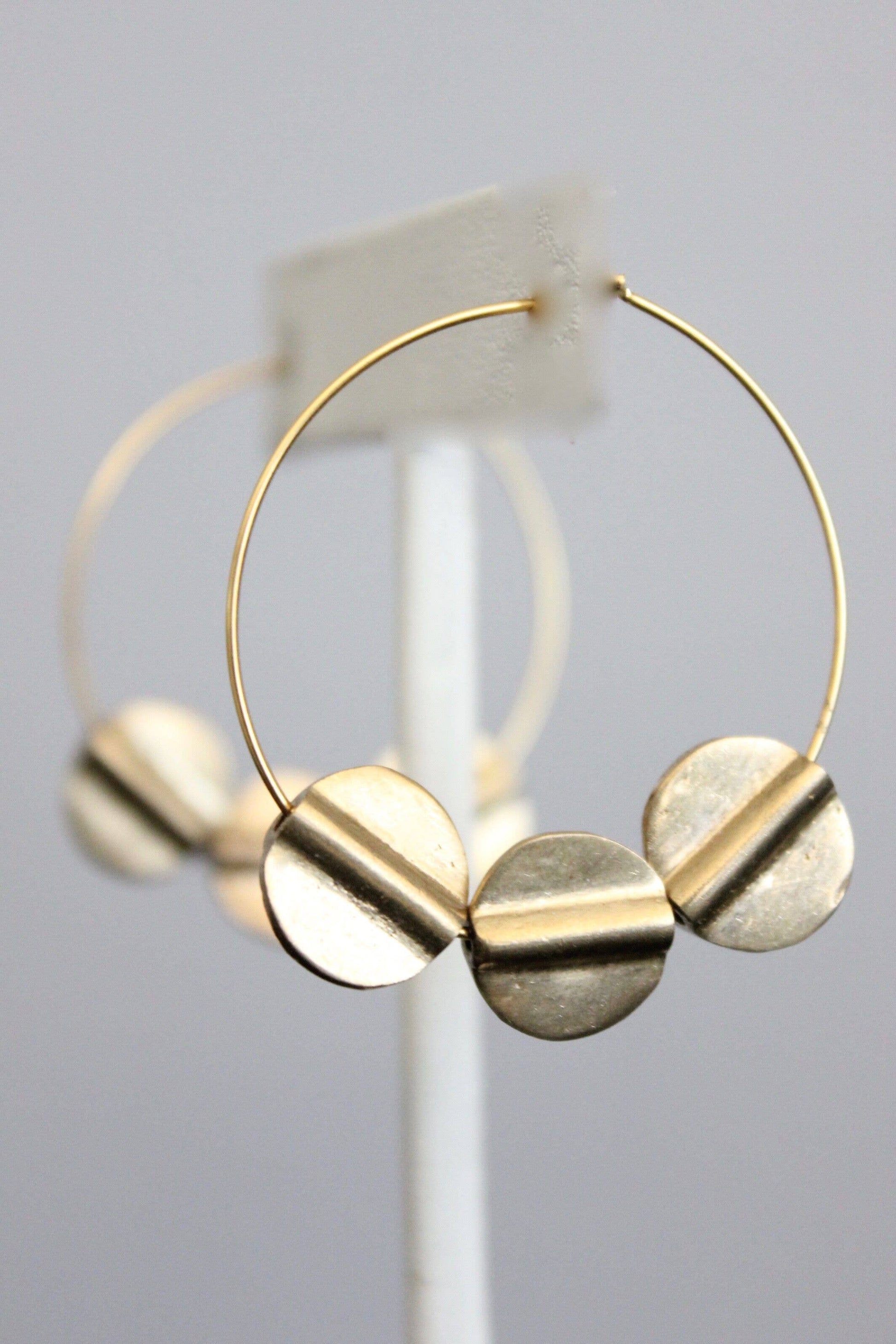 18k gold plated brass large hoop earrings with brass discs. 1.25 inches.