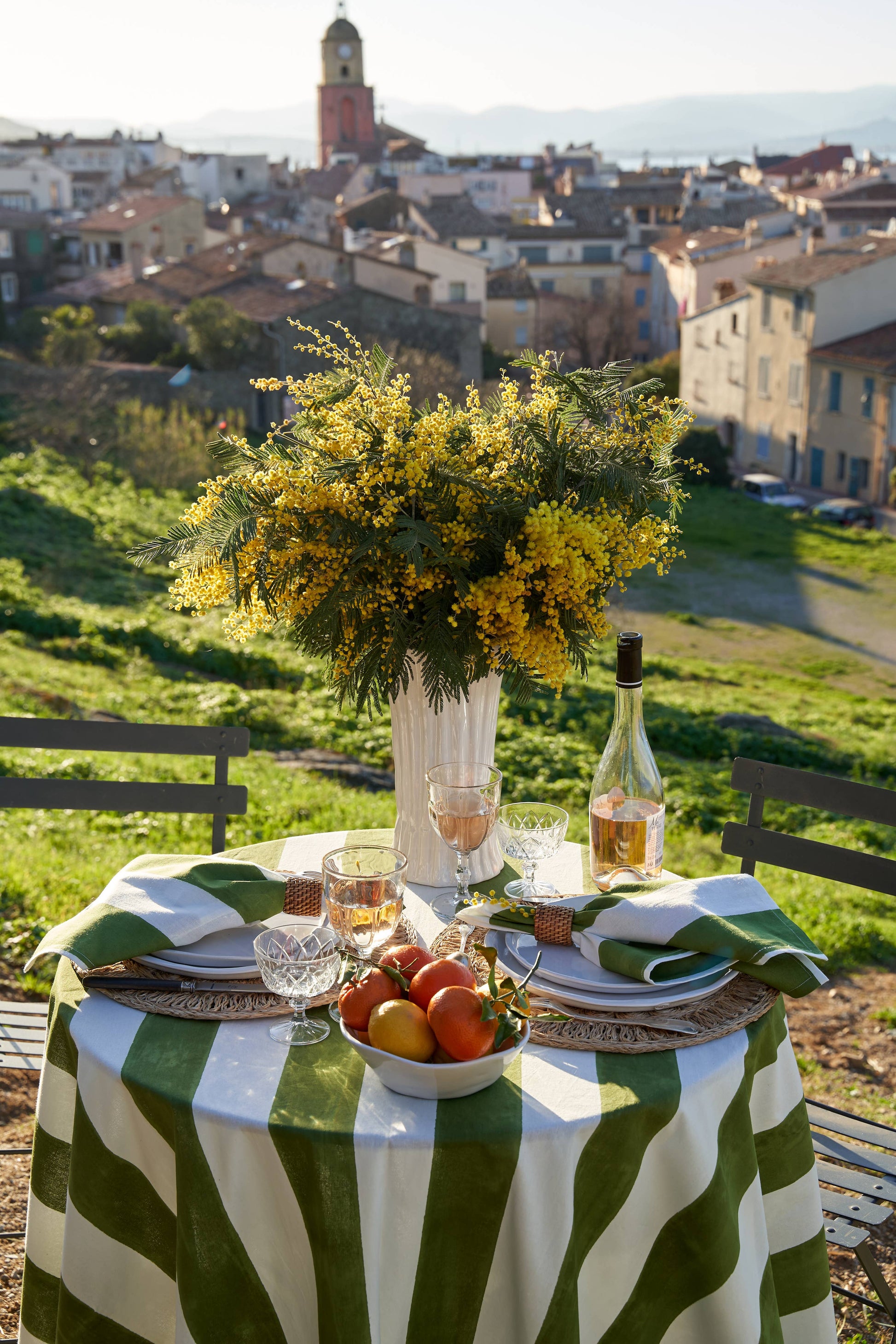 Transform your dining experience with the St. Tropez tablecloth, available in four stunning colors. Handcrafted with care, this piece features timeless wide cabana stripes, effortlessly bringing a touch of French sophistication to any meal. Made from a durable blend of heavyweight linen and cotton, it combines both luxury and practicality. Whether it's for a cozy family dinner or a lively 4th of July celebration, this machine washable tablecloth is designed for easy care without compromising on style. Elevate your table setting with the St. Tropez tablecloth—where beauty meets functionality.